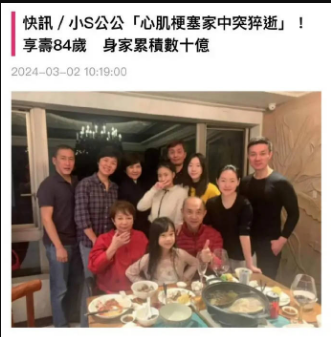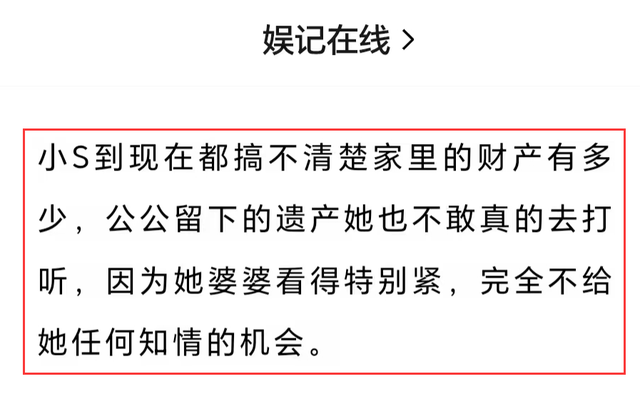 小S公公死字刚过了一周,着名娱记曝光一个大瓜,暗示小S到当今搞不透露家里的财产有些许,公公留住的遗产她也不敢确实探询。